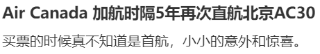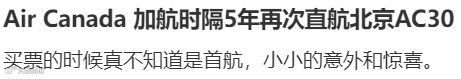 据该网友表示:“Air Canada加航时隔5年再次直航北京AC30买票的时候真不知道是首航,小小的意外和惊喜。”