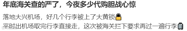 落地大兴机场,好几个行李被上了大黄锁,平时出机场取完行李直接走,这次被海关拦下要求再过一遍行李。”