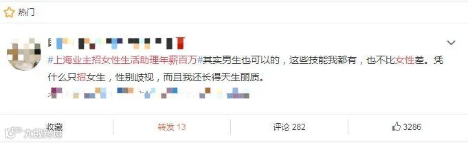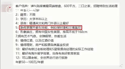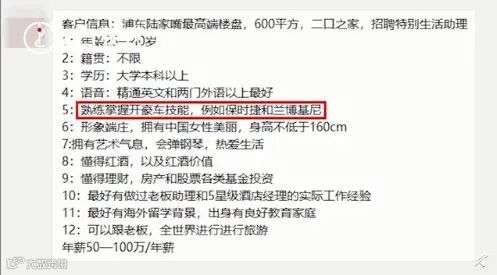 这不,微博爆出了一则热搜,上海某业主招聘女性生活助理,年薪给到了50W-100W之间。所谓“水涨船高”,工资上去了,硬件要求自然也高。