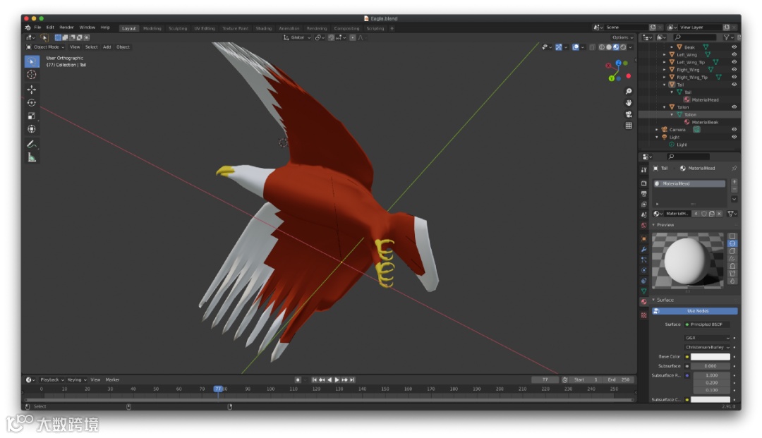 我增强了静态 3D 模型管理,以支持层级结构。原始的飞机模型是作为一个刚体移动的,它没有移动的身体部位。但是 Griffin 有两个翅膀,需要独立于身体单独运动。为此,我添加了两个翅膀,使之作为身体之上的单独 3D 模型。我可以单独旋转每个翅膀,也可以移动 Griffin 的身体,间接移动两个翅膀。实现该目标的一种恰当方式是构建骨骼动画系统,将身体部位组织为树结构的形式。但是,由于我要处理的身体部位只有三个(身体和两个翅膀),因此我可以选择一种简便的方式。为了编辑鹰和树 3D 模型,我使用了一个免费易用的 3D 编辑工具 Blender。