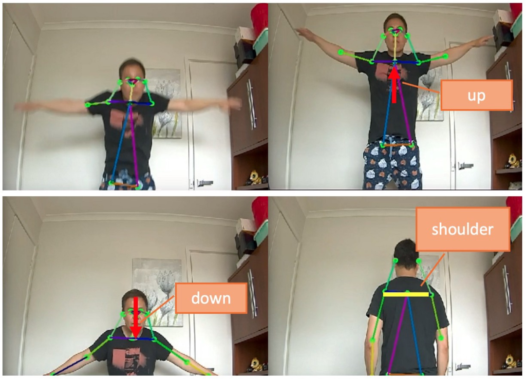 飞行时的身体转动:用于控制 Griffin 飞行时的方向。身体转动可以通过横轴和左右手肘向量之间的夹角进行计算(下图上)。在飞行时,两只翅膀基于这一转动角度同步移动。选择手肘而不是手腕是为了最大化可见度,因为手腕经常会掉出摄像头视角或被其他身体部位遮挡住。