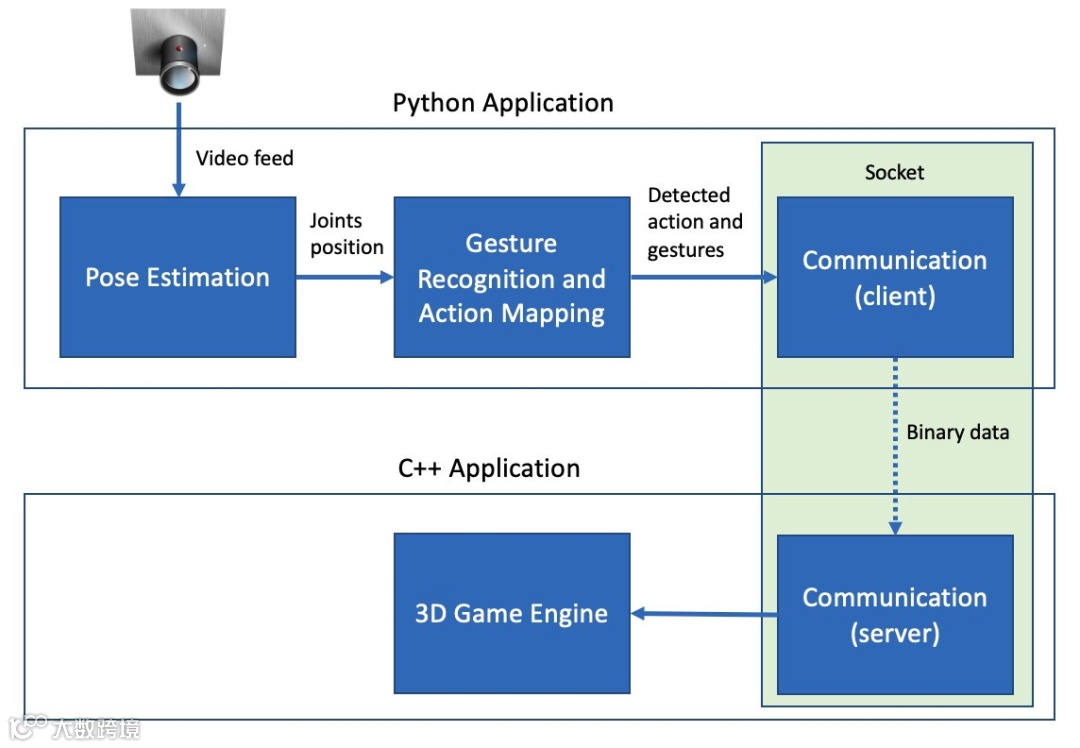 现在,我们完成了三个主要组件,只需要将它们粘合在一起就行了。我们需要将姿态估计模块检测到的人体关节点发送至手势识别模块,这个任务比较简单。但是,将动作和姿势映射结果发送至 3D 游戏引擎就不那么简单了,因为游戏引擎是用 C++ 写的。你可能会疑惑为什么不用 Python 构建 3D 游戏引擎,原因在于没有靠谱的方式来使用 Python 访问 OpenGL。此外,即使可能,我也不想花费好几周时间将 C++ 转换为 Python 代码。