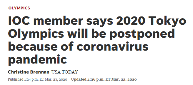 由于几个大国的纷纷抵制,资深的国际奥委会(IOC)委员迪克·庞德(Dick Pound)刚刚对《今日美国》透露,2020年东京奥运会将推迟至2021年,有关细节将在未来四周内制定。