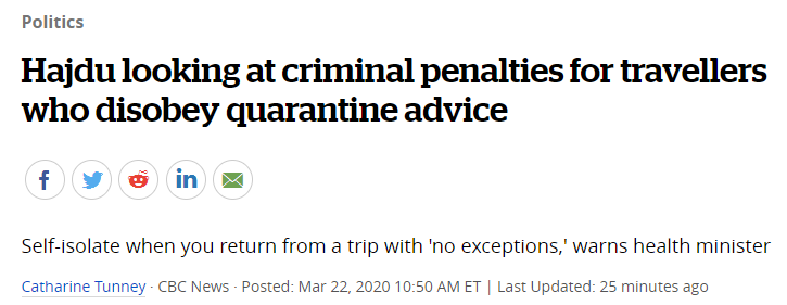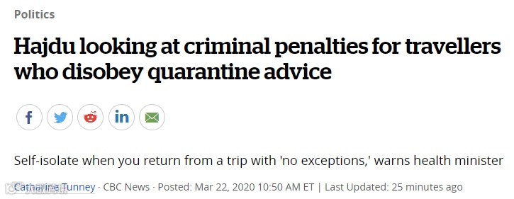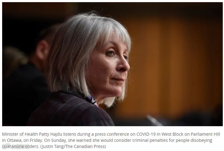 加拿大卫生部长Patty Hajdu也已经示表,政府将对违反隔离令的人处以刑责,不仅要罚款,严重的或许还要坐牢!