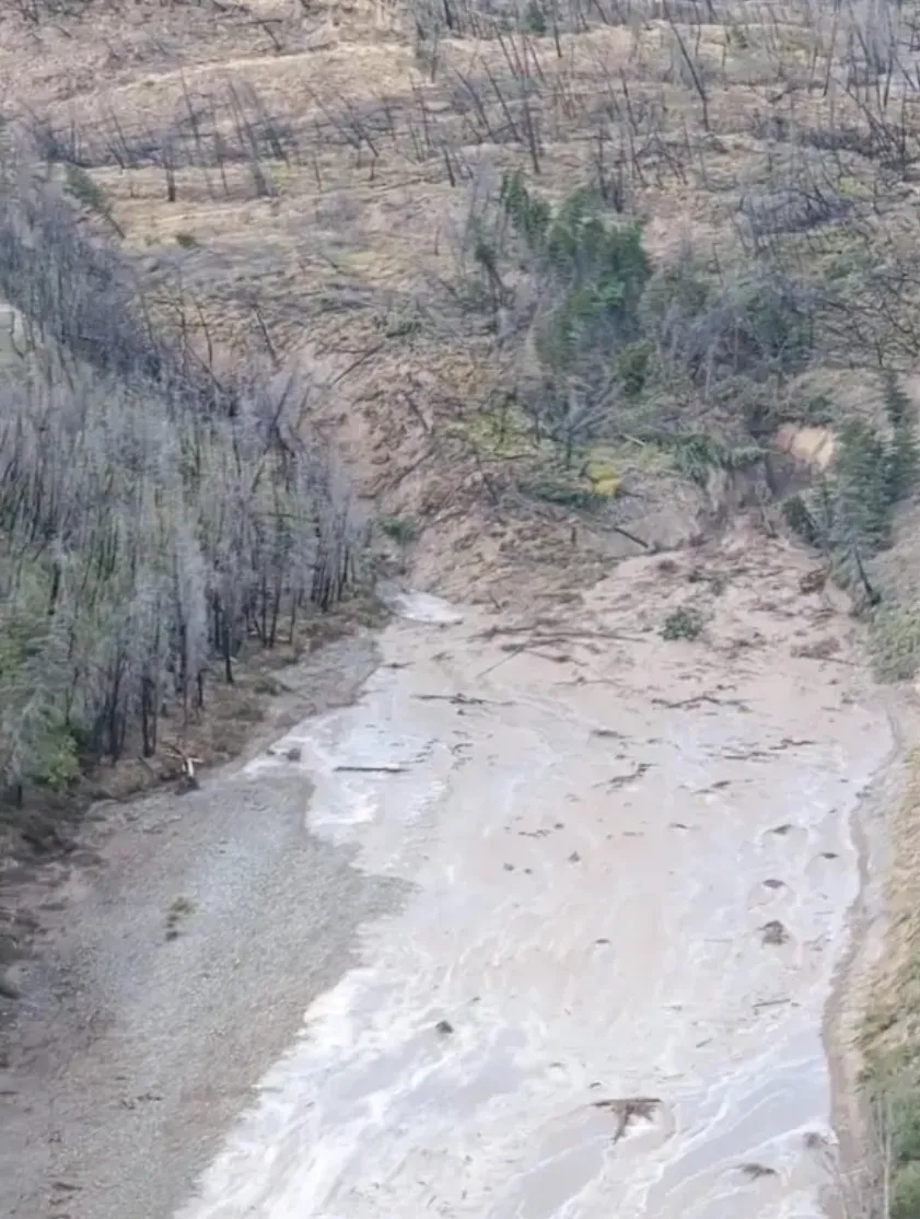 该帖子表示:“Chilcotin河山体滑坡产生的水和碎片正在向下游涌动,预计将在菲沙河下游造成强烈、高流量和危险”。