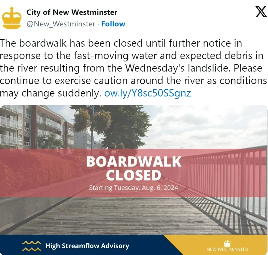 新西敏市政府在发布关闭木栈道的警告时称,情况可能会突然恶化,出于安全考虑,船只也应避免进入该区域。