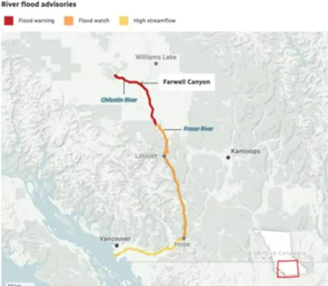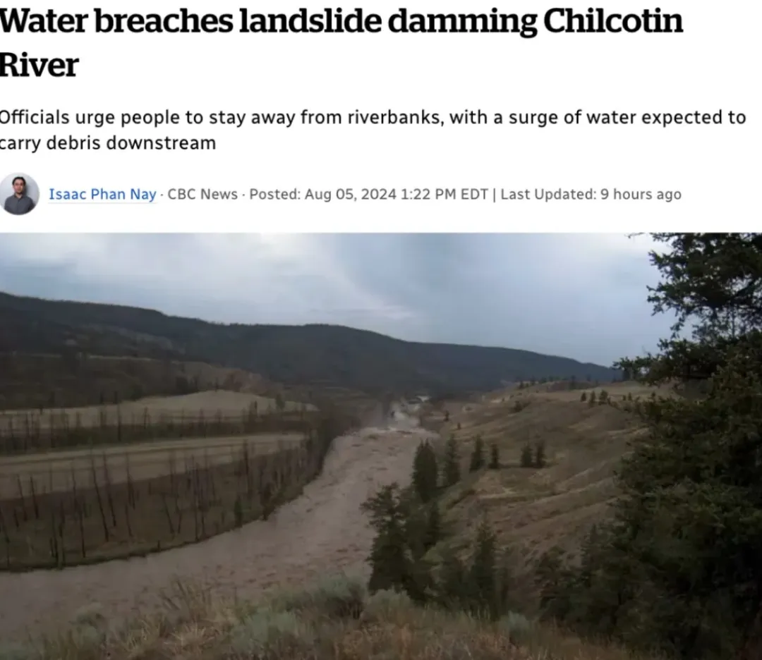 山体滑坡刚好截断并阻塞了Chilcotin河!而Chilcotin河是菲沙河的主要支流!