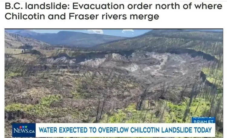 紧急事务官员称,BC省中部内陆地区的Chilcotin河发生大规模山体滑坡,导致数十处房产被疏散。