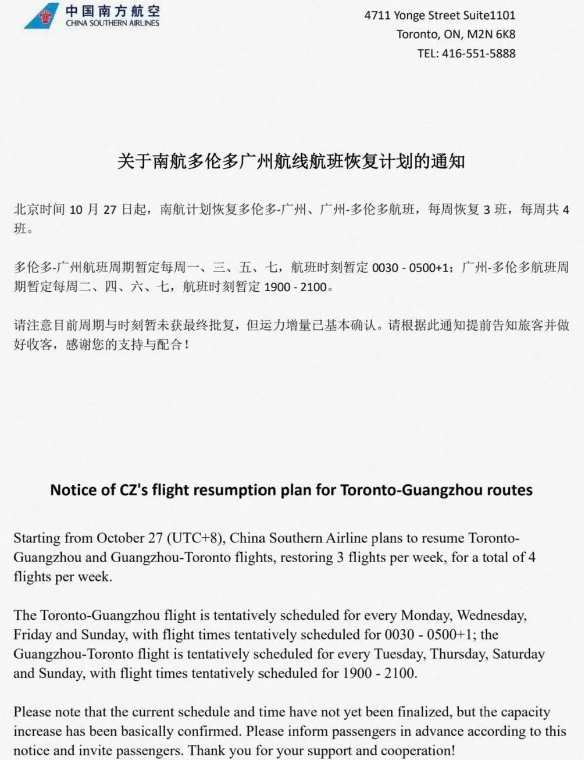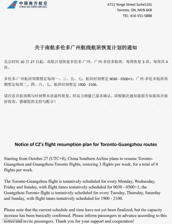 此外,中国南方航空发布了一份官方信息,表示将从10月27日起恢复多伦多广州航线的航班。