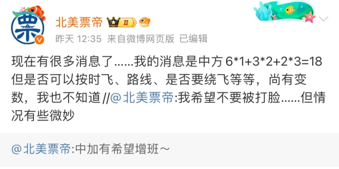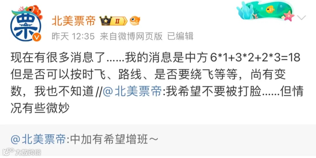 此外,@北美票帝还表示:“现在有很多消息……我的消息是中方6*1+3*2+2*3=18,但是否可以按时飞、路线、是否要绕飞等等,尚有变数,我也不知道。”