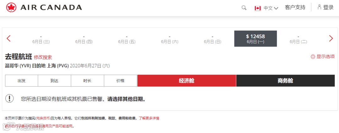 虽然,官网显示6月27号回上海经济仓还有12458加币(约6.2万人民币)一张令人乍舌的单程机票。不过,点击进去后也是无票的状态。