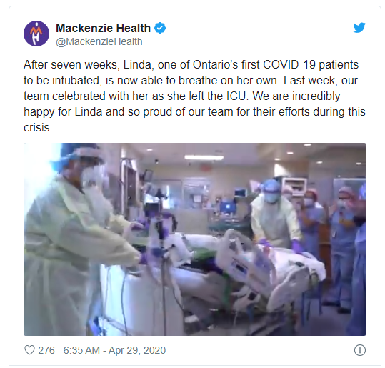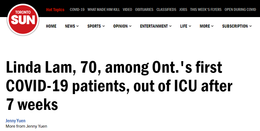林女士(Linda Lam),今年70岁,来自加拿大安省,是一名华裔。她是加拿大首批感染新冠的患者之一,在重症监护病房躺了7周后,几近接近死亡边缘的她,成功战胜了病毒,幸运的活了下来!
