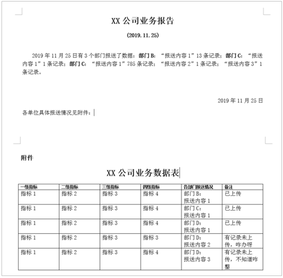 比如 X 年 X 月 X 日,有 N 个部门填报了数据,根据文档样例,文段描述部分需要整理成如下格式: