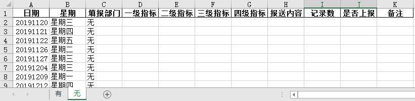 根据需要输出的日报样式,输出无记录的日报只需读取【日期】列和【填报部门】列,将【填报部门】列为无的日期段按每日输出即可。观察原表数据,直接筛选无填报记录的数据丢到命名为“无”的子表里。