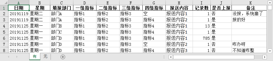 | lalala | hahaha | balabala | 若为空则沿用上级 | 部门A:报送内容1 | 有记录未上传,没报,系统崩了 |