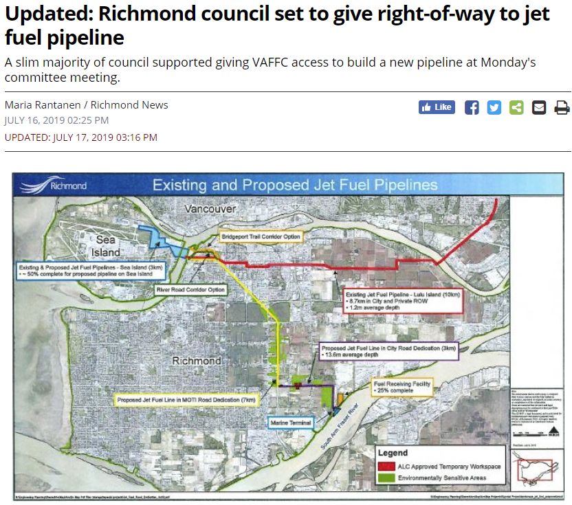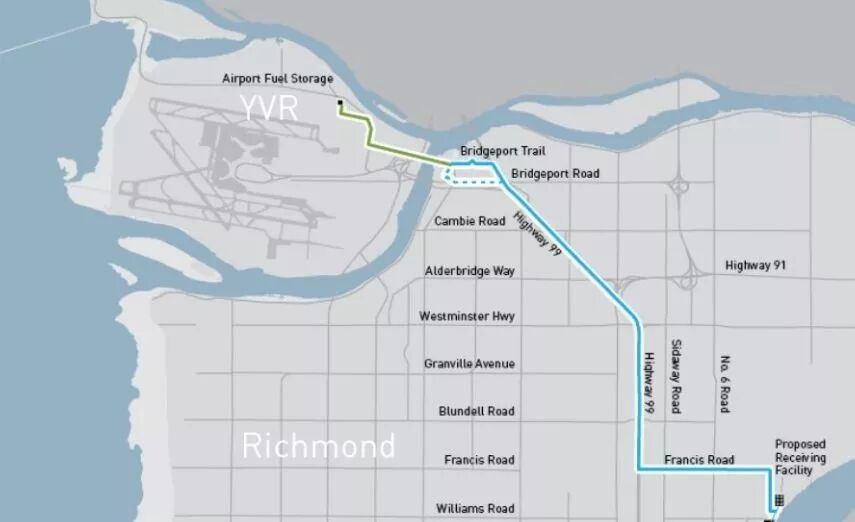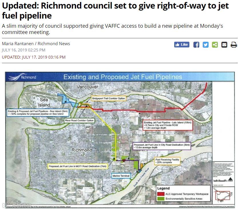 据Richmond News报道,自去年5月温哥华国际机场油管项目进入最后审批阶段之后,本周一(7月15日)再次获得重大进展:列治文市府最终同意给予温哥华机场燃料设施公司(VAFFC)在其道路上的通行特权,以修建新管道,取代1967年建造的旧管道。