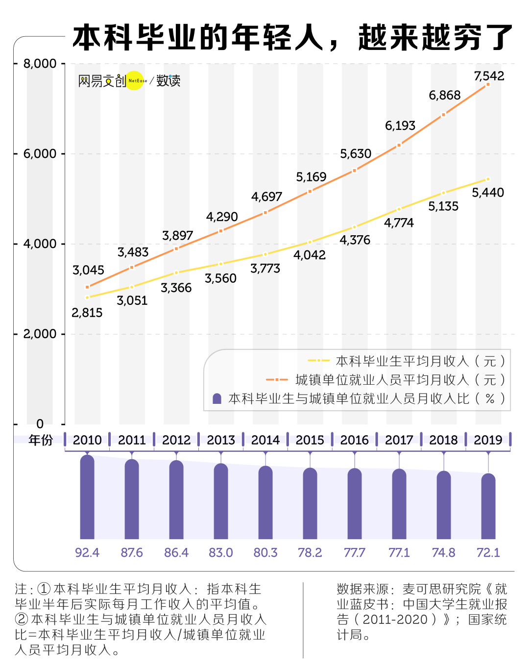 2010 年,本科生毕业半年后的平均工资是全国城镇单位就业人员平均工资的 92.4%,2019 年却下降到 72.1%。[5] 尽管人们的收入在逐年提升,但和社会发展水平相比,年轻人越来越穷是真的。