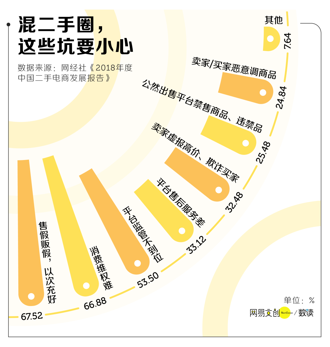 根据网经社的调查,在线二手交易的消费纠纷多围绕产品和平台展开,“售假贩假、以次充好”的问题最为常见,占比 67.52%,在所有问题中排名第一。[8]