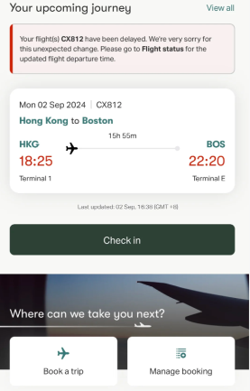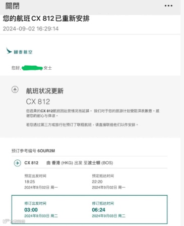 还有一位网友是乘坐国泰航空的航班从香港飞美国波士顿,也遭遇了延误。