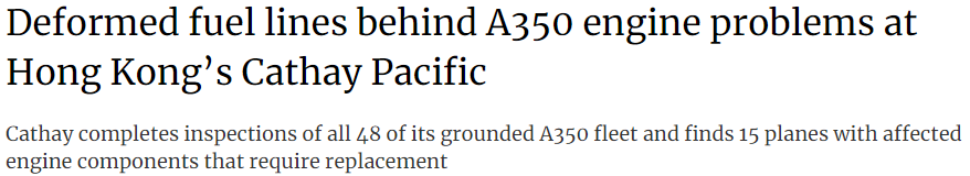 据悉在该航空公司的48架A350飞机中,只有15架被发现存在问题。