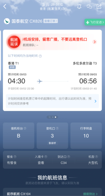 从这位网友发布的图可以看到,她所乘坐的是香港直飞多伦多的CX826航班,因为国泰航空的A350客机停飞检查,所以她的航班也受到了影响。