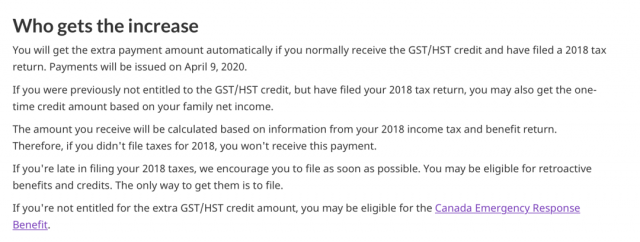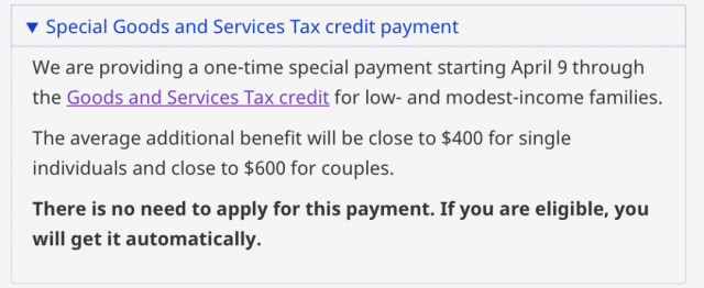 如果你2018年税务年有报税,你平时符合GST/HST退税,你就会在4月9日自动得到这笔津贴。