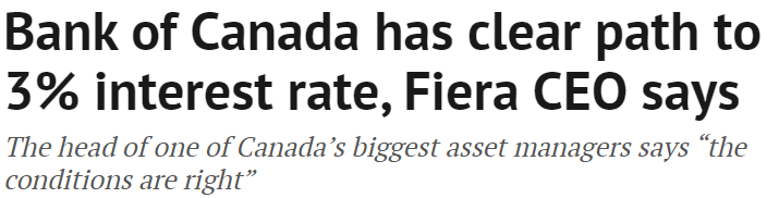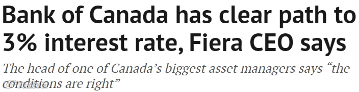 值得一提的是,最近加拿大最大资产管理公司之一的负责人表示,加拿大央行(Bank of Canada)在明年年底前将政策利率下调至3%左右的“条件已经成熟”。