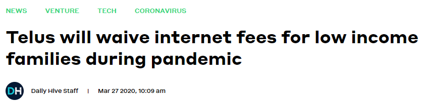 加拿大网络巨头之一Telus也加入免费赠送大环节,Telus将为低收入家庭提供两个月的免费高速上网,其他没有无线上网的家庭也不会被收取超出的费用。