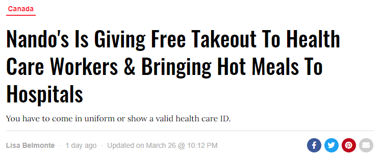 加拿大一家烤鸡连锁店Nando's宣布从3月26日起,任何穿着工服或携带有效工作证到店的医护人员都可以得到一份免费的外带食物!