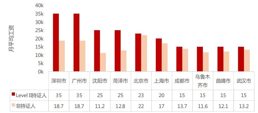 LEVEL II持证人群和非持证人群月薪TOP10城市比对