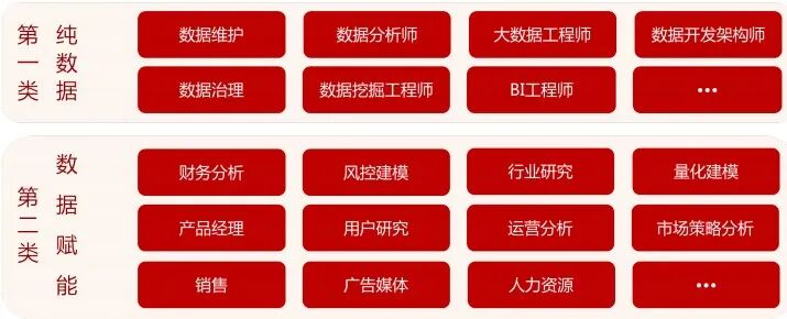 另外,企业数字化转型中,不同行业不同岗位都对数据分析技能提出了要求,使得数据赋能岗位多样化,渗透各行业。