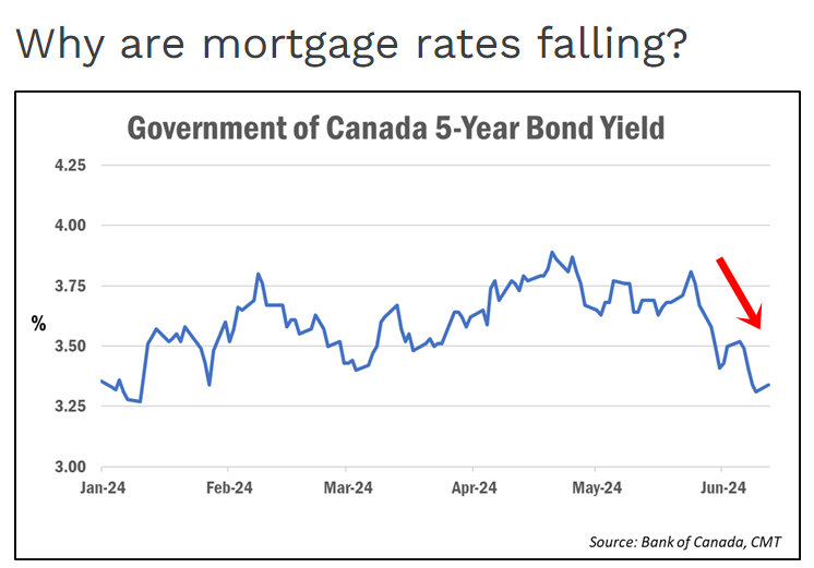 利率之所以下降,是因为加拿大债券收益率的持续下降。