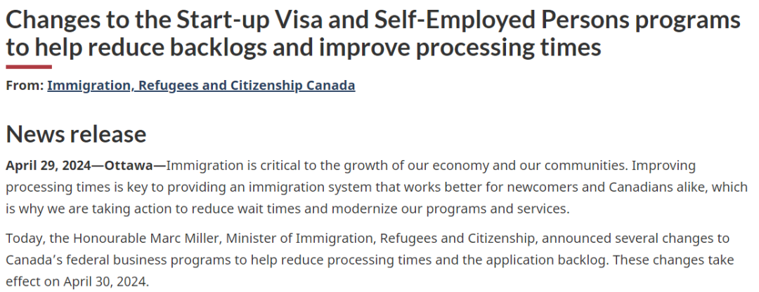 https://www.canada.ca/en/immigration-refugees-citizenship/news/2024/04/changes-to-the-start-up-visa-and-self-employed-persons-programs-to-help-reduce-backlogs-and-improve-processing-times.html#:~:text=By%20restricting%20application%20intake%20through,welcome%20the%20talented%2C%20innovative%20and