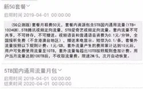 包含5TB国内通用流量、全国接听免费、短信0.1元每条。超出流量套餐使用外的流量费用为1元每GB。累计超出10元,可免费流量增至10TB;