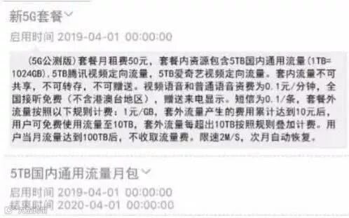 5G套餐月租50元。包括全国每月手机流量5000G;如果用超了,再加10元就还能用5000G。。。再用超就按照这个费用再加;但是如果当月使用流量超过了100000G;就会限速,下月再恢复。。。