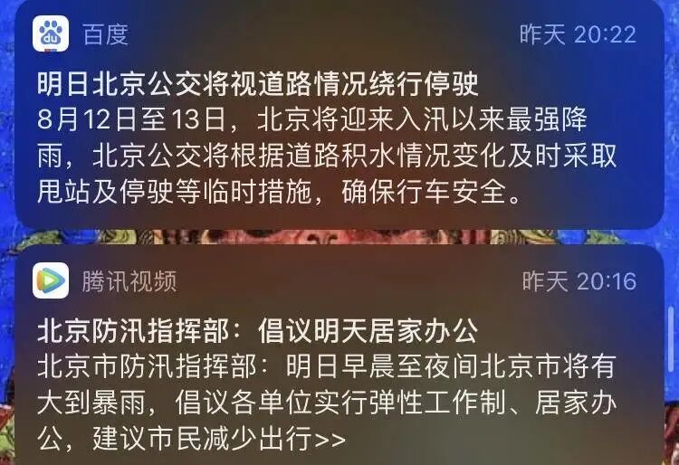 根据气象部门预报,8 月 12 日北京将迎来今年入汛以来最强降雨,各级部门都发出了预警通知。