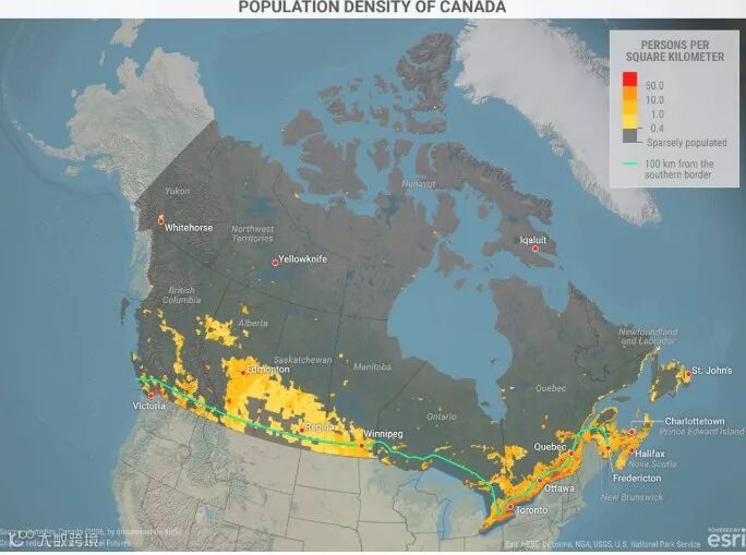 以下是加拿大人口密度分布图,显示加国大多数人口居住在距离美国边境100英里(160公里)的相当狭窄的地带。