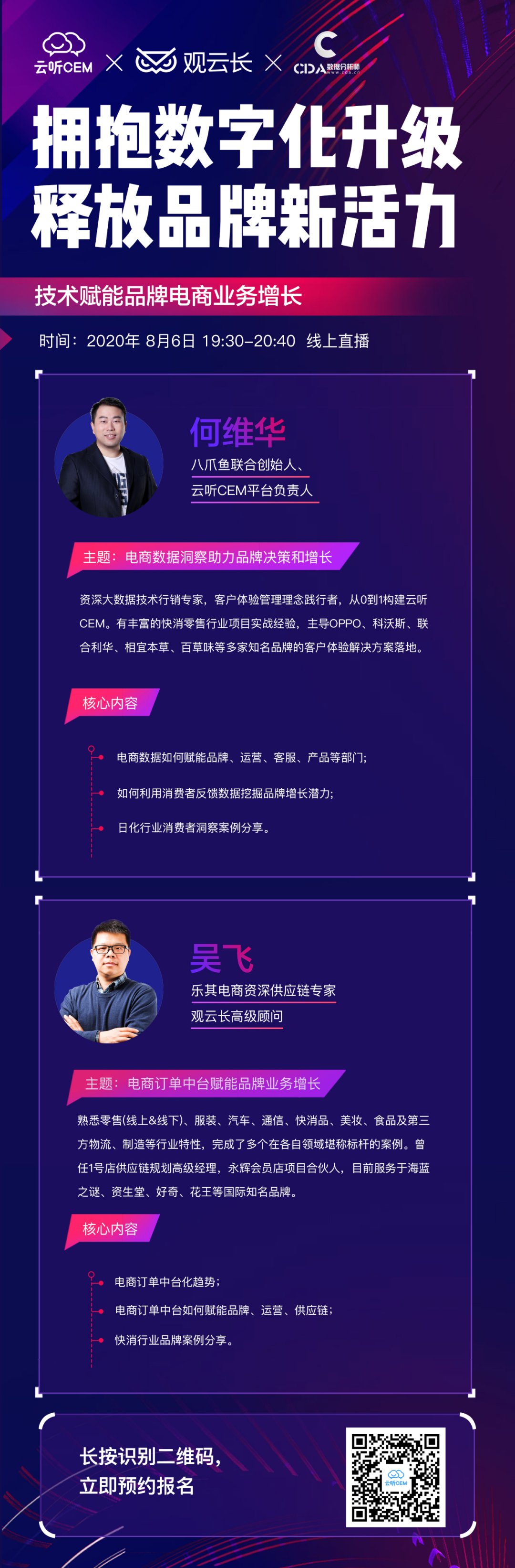 何维华 Tony 八爪鱼联合创始人、云听CEM平台负责人。资深大数据技术行销专家,客户体验管理理念践行者,从0到1构建云听CEM。有丰富的快消零售行业项目实战经验,主导OPPO、科沃斯、联合利华、相宜本草、百草味等多家知名品牌的客户体验解决方案落地。