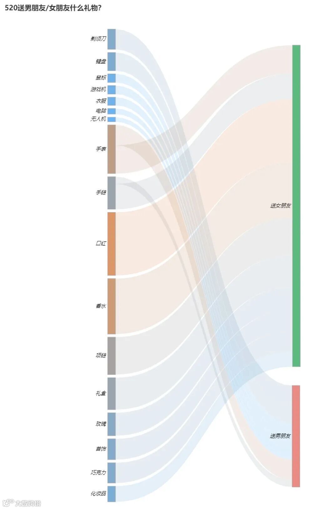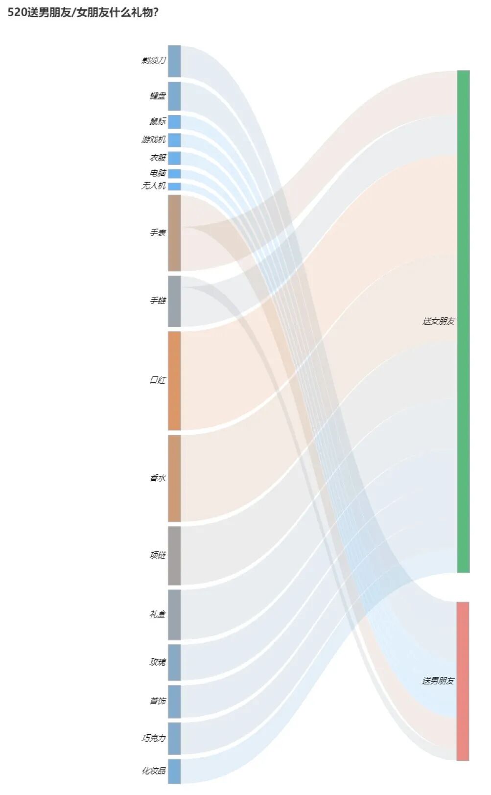 看来送什么礼物这方面跟知乎得出的结论类似,从中我们也发现到在520情人节,主要男生给女生买礼物占比较大,当然也不排除许多小姐姐们趁着520淘宝活动给自己买买买的。