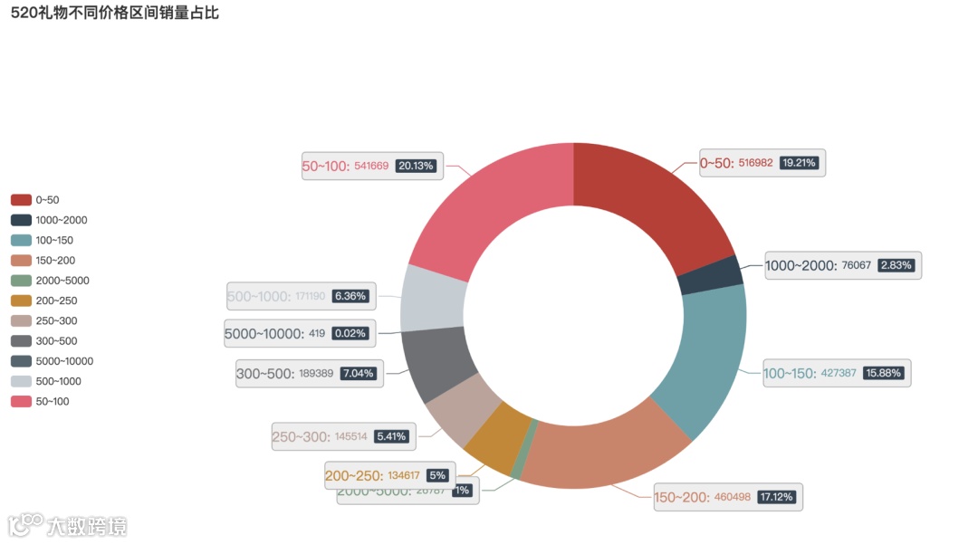 看完了520商品的价格区间,再看看什么价位的商品销量最好。分析可以发现,200元以内的商品最受人青睐。其中0-50元销量占比达到19.21%,50-100占比20.13%。100-150和150-200的占比也不错,分别为15.88%到17.12%。