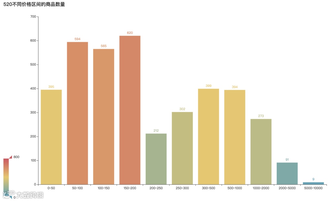 那么520期间商品的价格都是怎么分布的呢?从图中可以看到50元以下的并不多,50-200元内的商品最多。