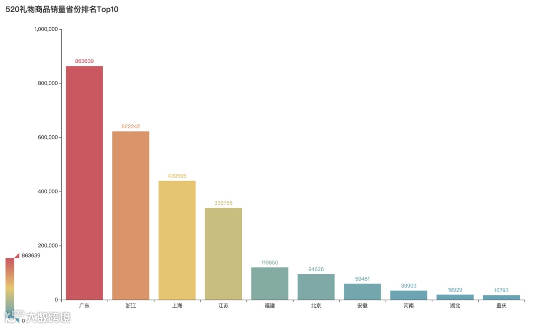 那么520期间哪些省份的人最喜欢买买买呢?数据整理发现,广东人民拔得头筹,其次浙江、上海位列二三。