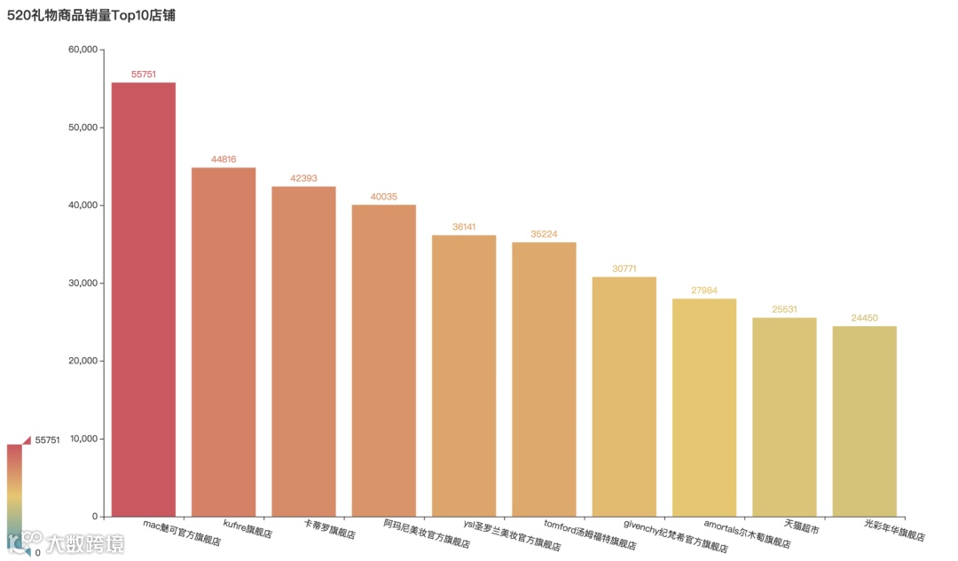 Mac名列第一,果然是小姐姐们人手一支的口红,没毛病。其次阿玛尼、ysl、Tomford、纪梵希全都榜上有名。有意思的是第二名的店铺是一家主营创意礼物的店kufire,当中从创意灯、按摩枕等礼物还不少。这也可能跟这家店搜索时页面比较靠前有关吧。