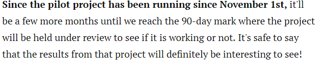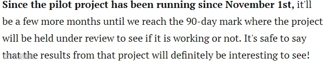 此次试行项目从11月1日起,在第51和第52分区试行90天。现在才过去一个月,谈效果还为时尚早。小编也会持续关注这件事看看两个月过后究竟又是一个怎样的局面...