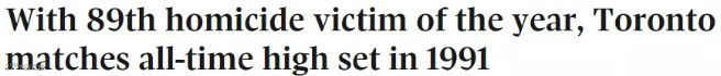 前不久,凶杀案件还刷新了1991年多伦多凶杀案死亡人数的历史记录。