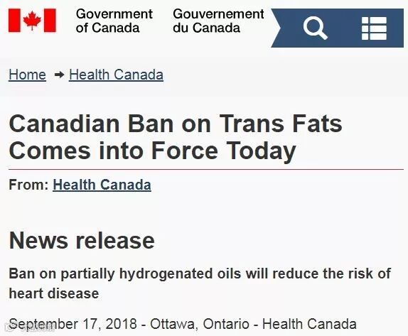 加拿大卫生部在今天的新闻稿中指出:卫生部长Ginette Petitpas Taylor 宣布,从今天起,制造商将PHO添加到加拿大销售的食品中是违法的。这项禁令不仅仅针对在加拿大生产的食品,也针对所有进口的食品,并且包括餐馆等食品服务行业所准备的食品。