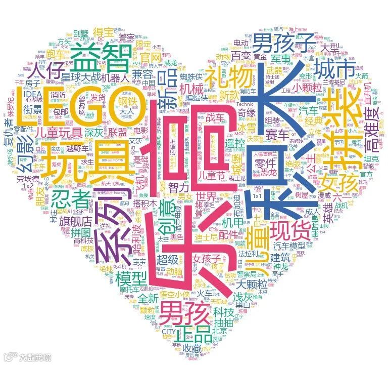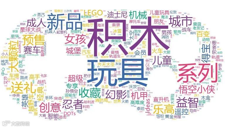 下面看到淘宝乐高相关标题的词云,"乐高"、"玩具"、"积木"都是提及最多的关键词。同时"益智"、"系列"、"正品"等词也是标题中常有的词。