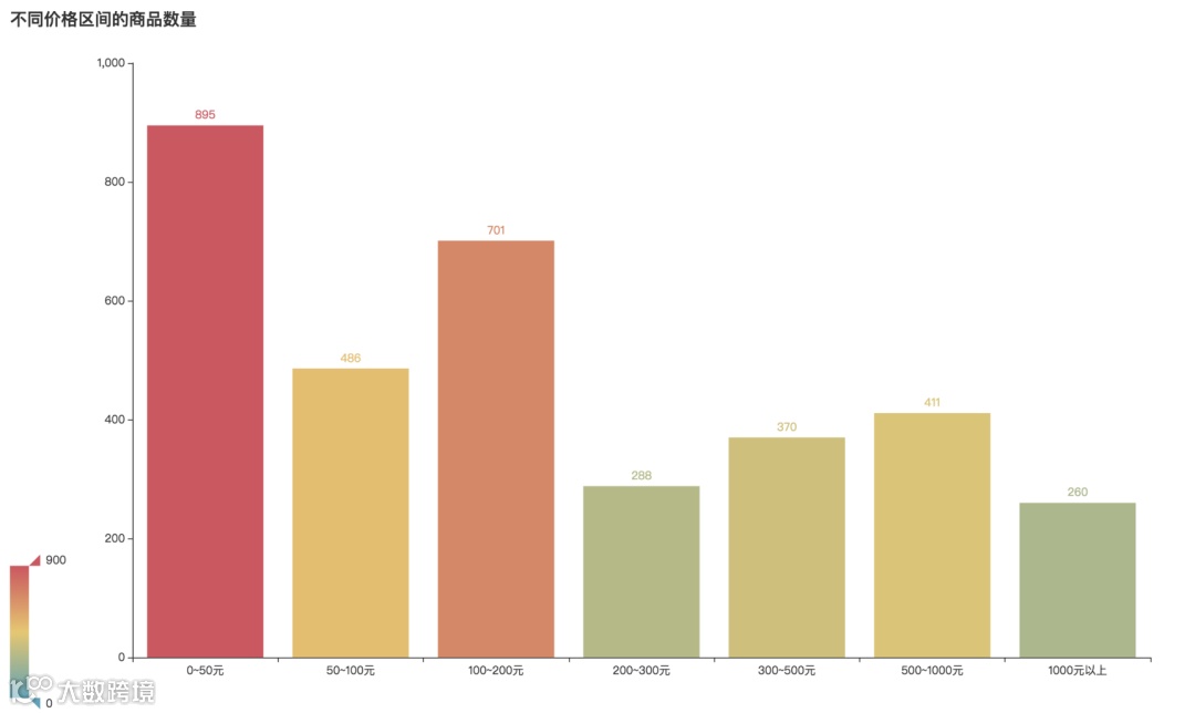 在商品价格区间方面,可以看到数量最多的还是0-50元的平价款,共2082件商品,远远高于其他价格区间。其次50-100元的商品有495件。