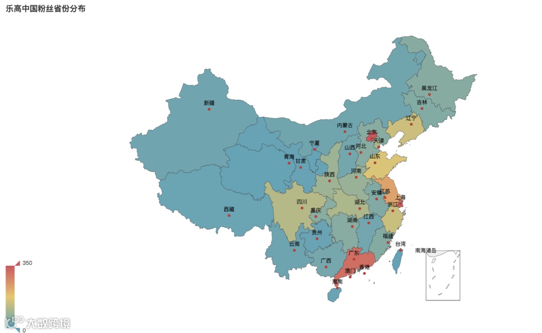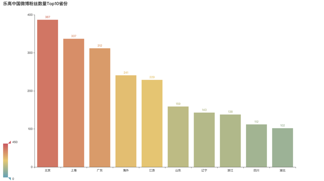 从图中可以看到,北上广位居前三,海外的粉丝也不少,位居第四。之后就是江苏、山东分别为第五和第六。