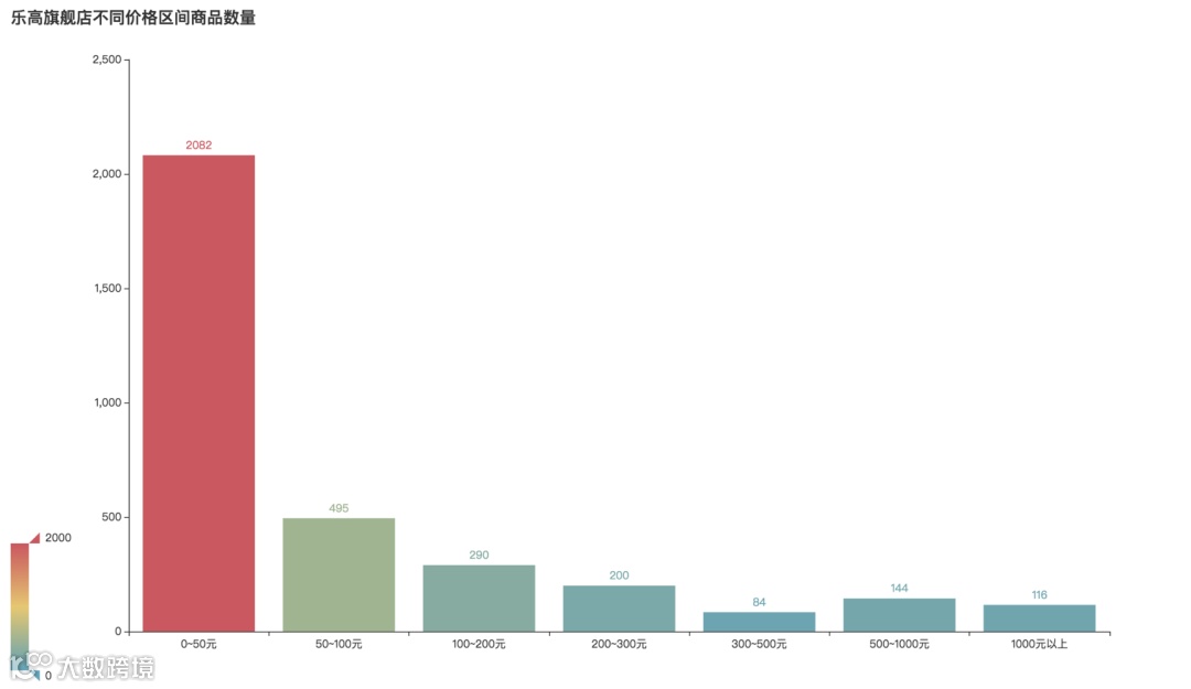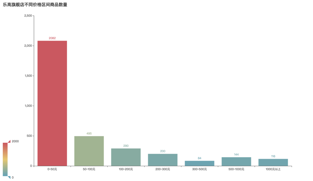 乐高的定价如何呢?我们可以看到0-50元的乐高商品是最多的,达到895件。其次100-200元的也不少,以701件位居第二。1000元以上的资深玩家款最少,为260件。